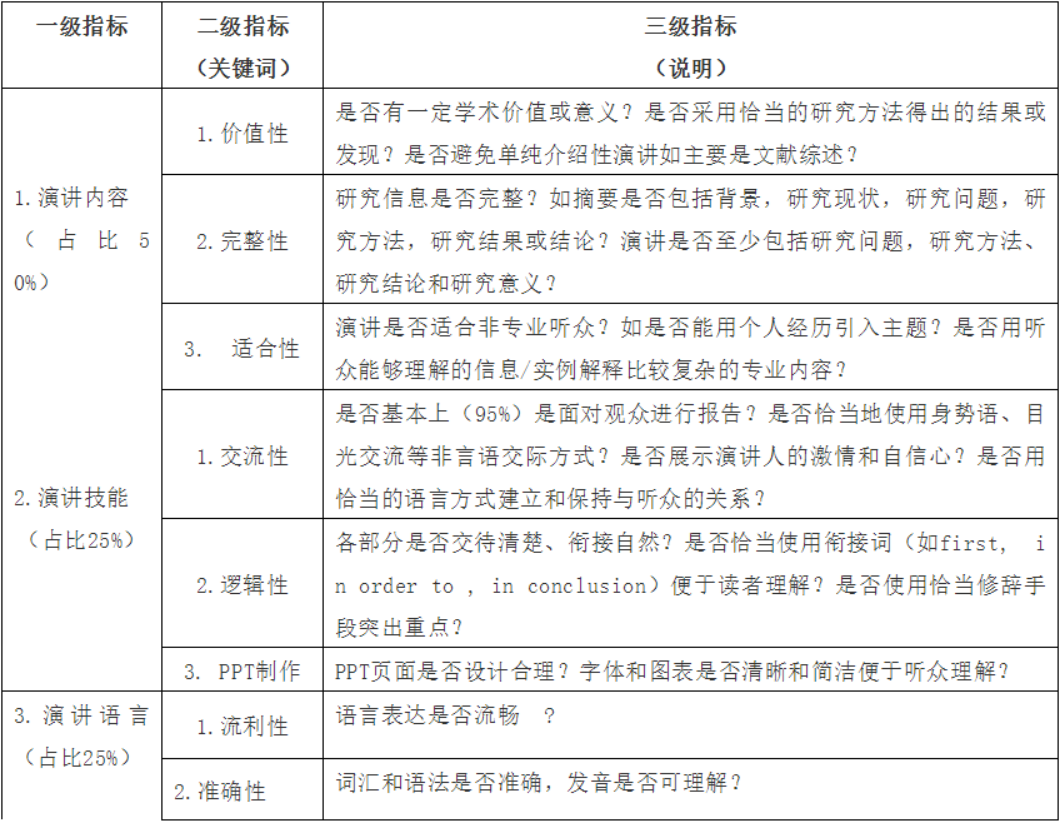 (二)参赛选手需用易于理解的英语、在5分钟时间内向没有专业背景的听众(这是判断演讲成功与否的一个重要标准)介绍一项基于自己专业相关(包括专业科普类)的研究项目(不是介绍性或文献综述性报告)。